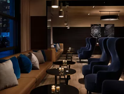 A lounge is approximately 4,000 square feet of luxurious, open flow amenity spaces, including a stunning bar and fireplace, and contemporary, comfortable seating with open views onto the street scape