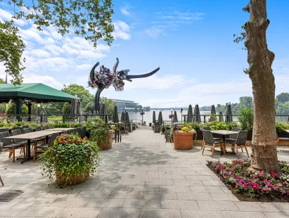 Indoor and outdoor dining with absolutely stunning views overlooking the Potomac River, Kennedy Center, Memorial Bridge, Roosevelt Island, Watergate, Key Bridge and the Virginia skyline.