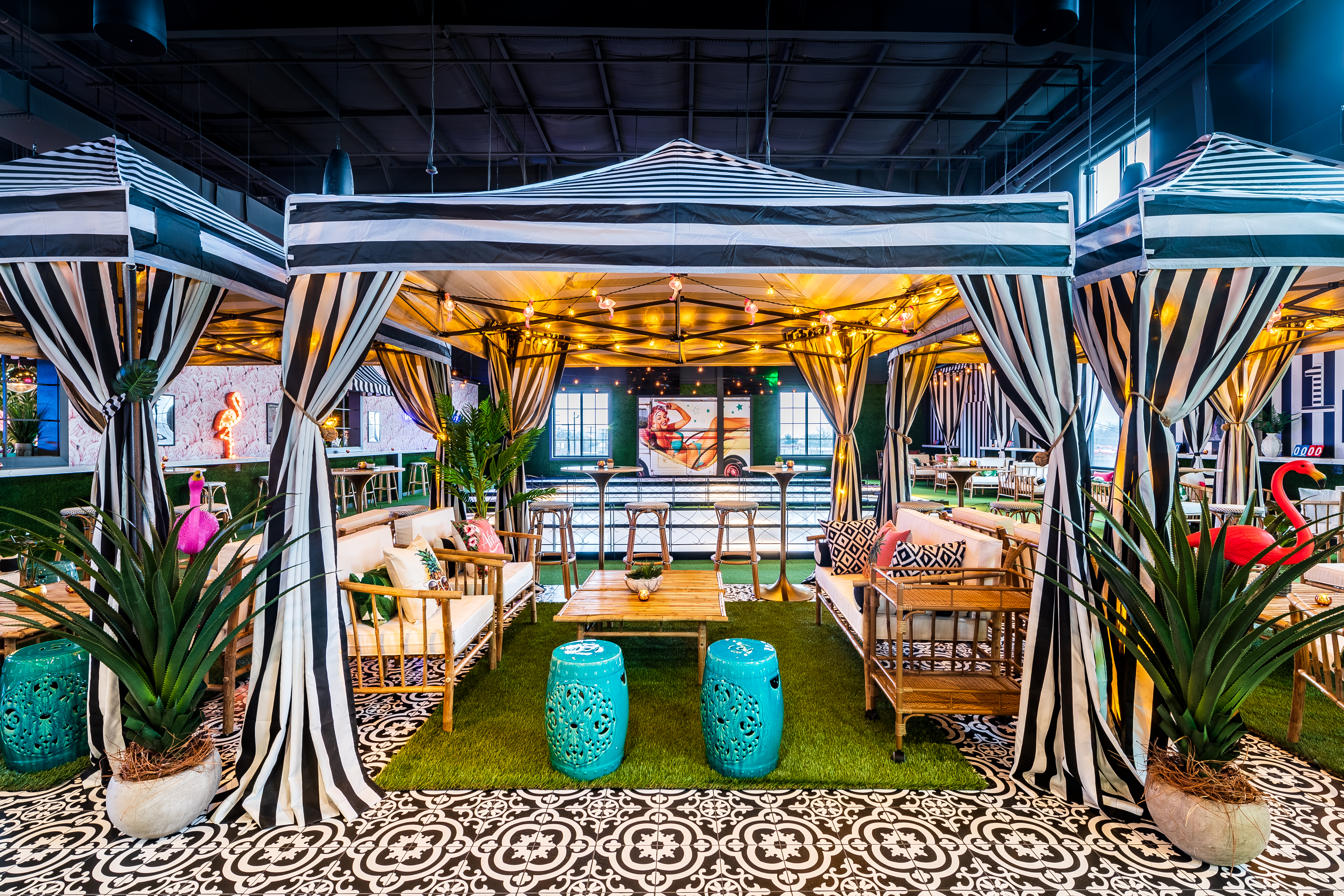 Flamingle upstairs at THRōW Social in an easy, breezy tropical atmosphere. Sip on specialty cocktails, indulge in mouthwatering food, and enjoy live DJs all day (or night!) long. Rent a VIP Cabana, play backyard-style games like corn hole & light-up ping-pong, then dance the night away!