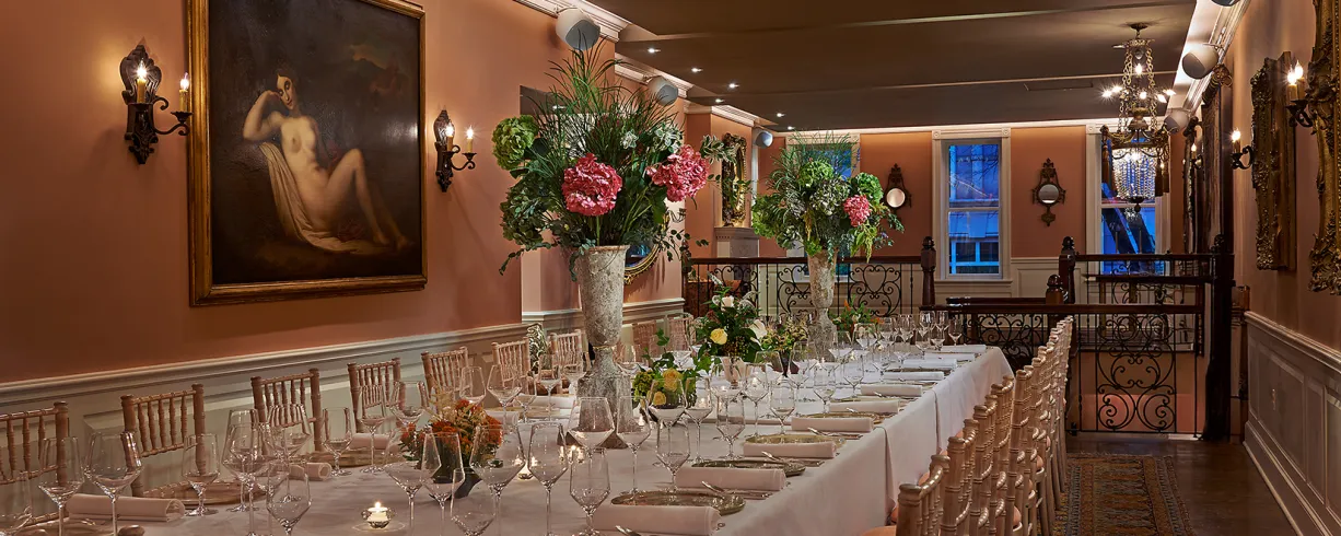 Elegant townhouse venue with no room fee, full-service catering, fine dining service, and customizable event space for up to 120 guests.